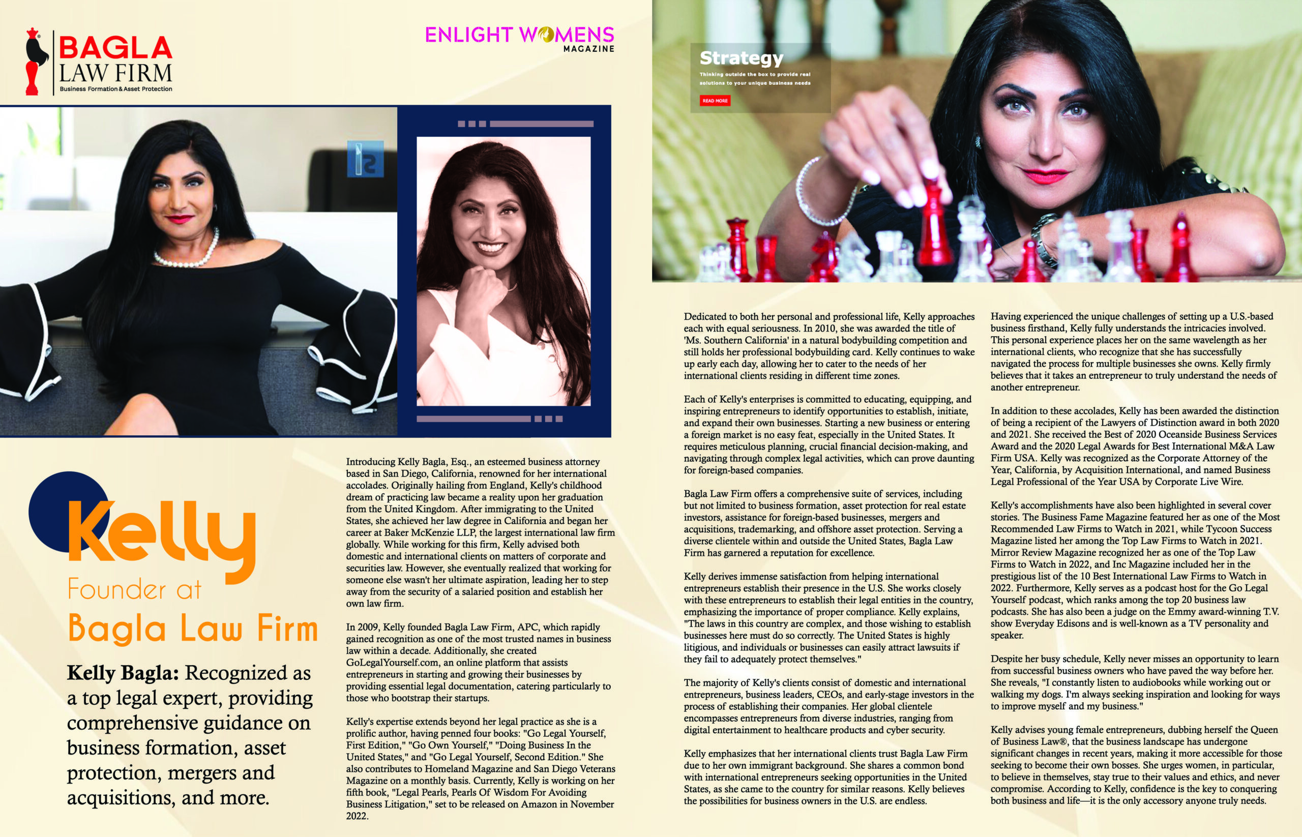 Introducing Kelly Bagla, Esq., an esteemed business attorney based in San Diego, California, renowned for her international accolades. Originally hailing from England, Kelly’s childhood dream of practicing law became a reality upon her graduation from the United Kingdom. After immigrating to the United States, she achieved her law degree in California and began her career at Baker McKenzie LLP, the largest international law firm globally. While working for this firm, Kelly advised both domestic and international clients on matters of corporate and securities law. However, she eventually realized that working for someone else wasn’t her ultimate aspiration, leading her to step away from the security of a salaried position and establish her own law firm.
