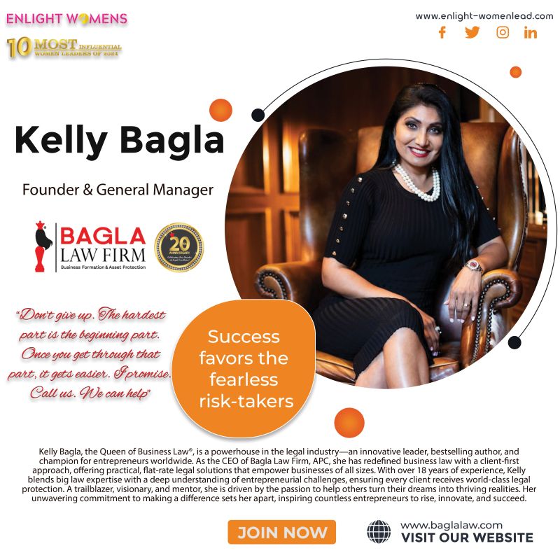 In 2009, Kelly founded Bagla Law Firm, APC, which rapidly gained recognition as one of the most trusted names in business law within a decade. Additionally, she created GoLegalYourself.com, an online platform that assists entrepreneurs in starting and growing their businesses by providing essential legal documentation, catering particularly to those who bootstrap their startups.